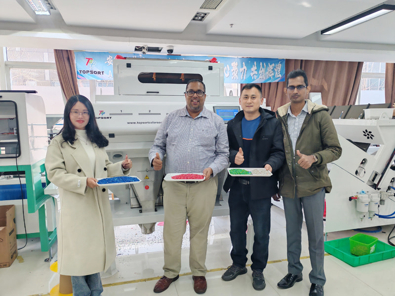 ยินดีต้อนรับแขกต่างชาติเข้าเยี่ยมชมโรงงานของเรา และทดสอบผลิตภัณฑ์ของเรา เครื่องแยกสีพลาสติก ลูกค้านำตัวอย่างมา 3 กิโลกรัม วิศวกรของเราได้แยกชิ้นส่วนสีแดง สีเขียว สีน้ำเงิน และสีขาวออกจากชิ้นส่วนสีผสมตามความต้องการของลูกค้าอย่างรวดเร็ว ลูกค้าชื่นชมความเร็วและประสิทธิภาพสูงของเราเป็นอย่างมาก หากคุณต้องการเพิ่มผลกำไรและผลผลิตจากการรีไซเคิลพลาสติก เครื่องคัดแยกสี TOPSORT คือตัวเลือกที่ดีที่สุดของคุณ คัดแยกพลาสติกประเภทต่างๆ เช่น PET, HDPE, PVC และเม็ดพลาสติก และกำจัดความแตกต่างของสีเล็กน้อยและวัสดุที่ไม่ต้องการ เราทำให้การรีไซเคิลพลาสติกเป็นเรื่องง่าย
